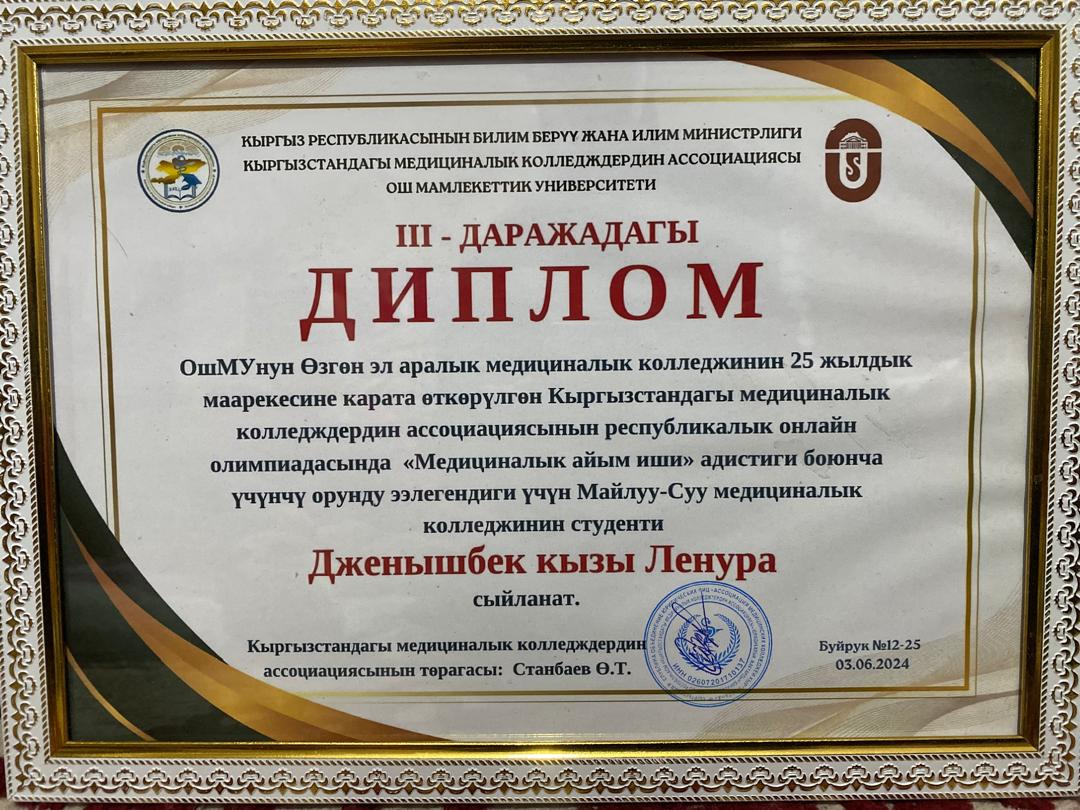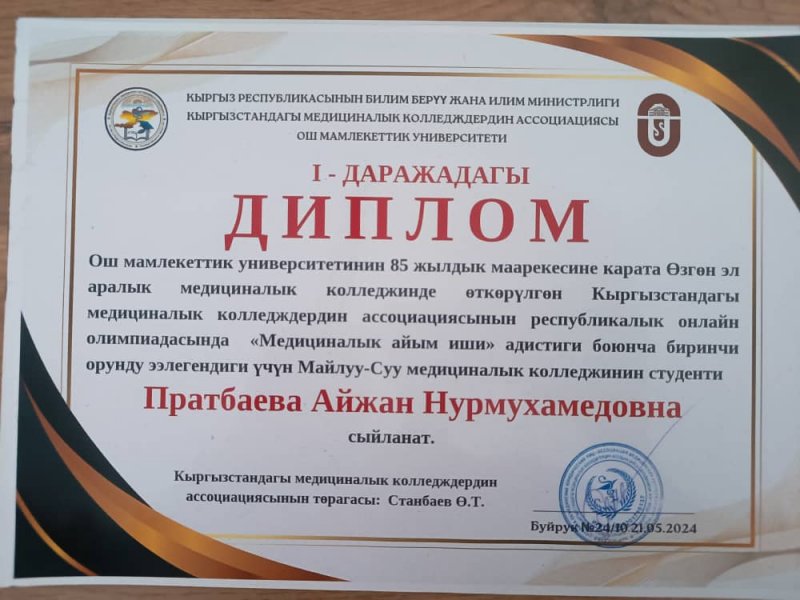 - 2024-жыл 20-май күнү Ош мамлекеттик университетинин 85 жылдык маарекесине карата өткөрүлгөн "Медициналык айым иши" жана “Фармация” адистиктери боюнча Кыргызстандагы медициналык колледждердин ассоциациясынын республикалык олимпиадасы болуп оттү.