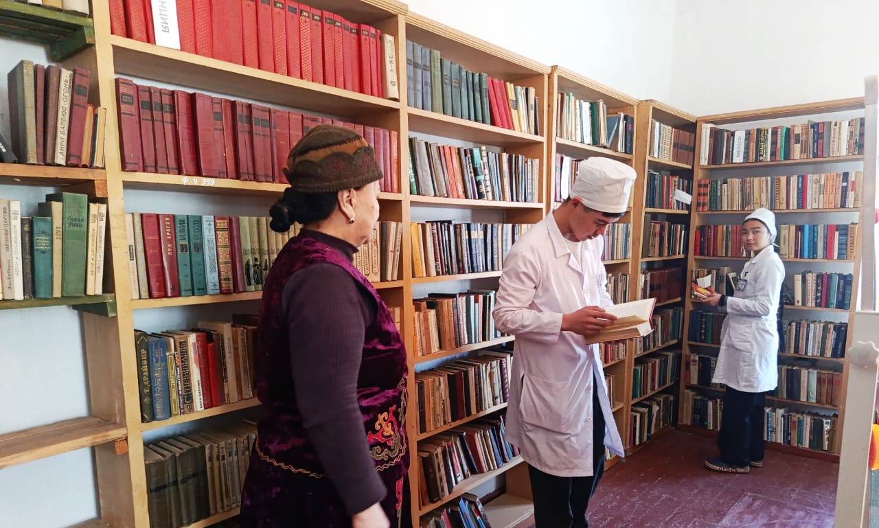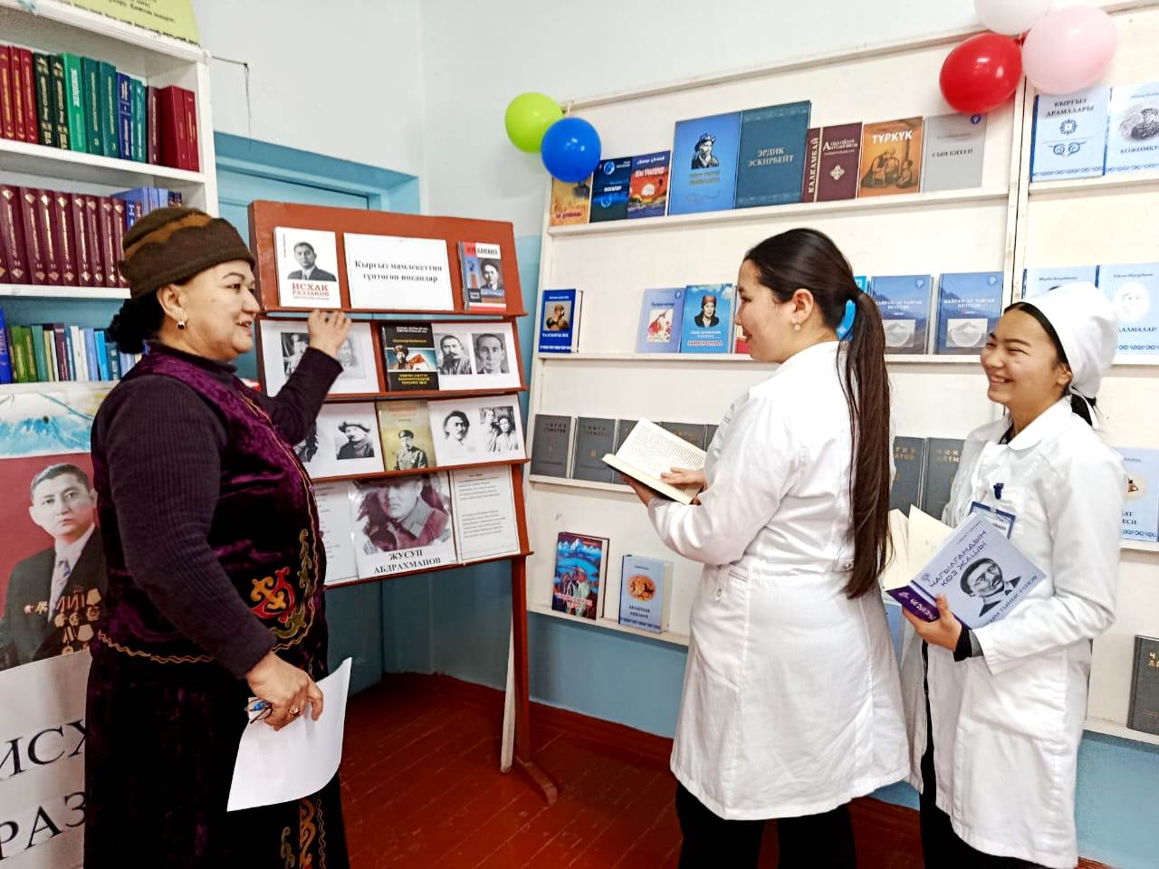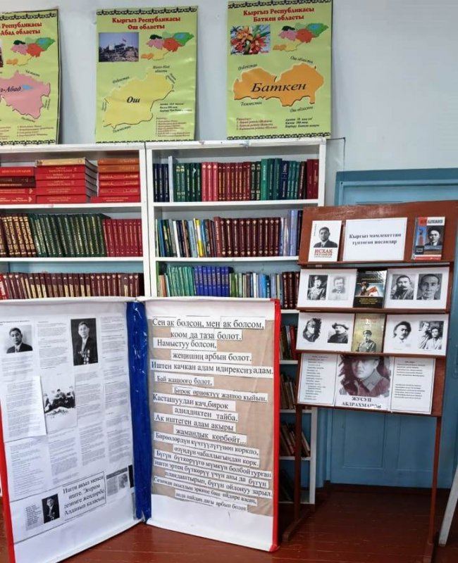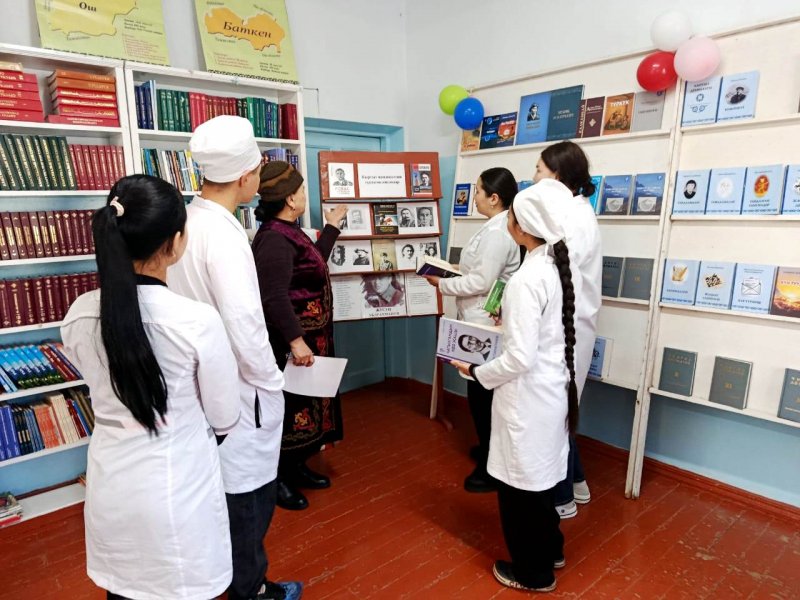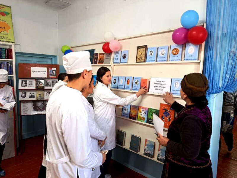 КөргөзмөдөЧ.Айтматовдун 12 томдугу, “Курманжан Датка, К.Осмоналиевдин “Көчмөндөр кагылышы”, Абдыкадыр Орозбековдун Кыргыз улуттук мамлекеттүүлүгүн түзүүдөгү орду”, “Юсуп Абдрахманов”, К.Тыныстановдун “Чагылгандын көз жашы” ; “Кайран эл тайгак кечүүдө 1-2 томдугу, К.Жантөшөвдун “Каныбек” романынын 1-2 томдугу; “Улут маданиятына чабуул” ; А.Осмоновдун 110 жылдыгына карата “ Алыкул Осмоновдун “Көл толкуну”; С.Жигитовдун “Күн тууду” ; У.Абдикаимовдун “Майдан” , А.Бегимкулованын “ Экинчи өмүр” ж.б. адабий китептер, тамсилдер, тандалмалар көрсөтүлдү.Студенттер чет эл жазуучулардын ктитептерин, медициналык китептерге да кызыгып , китепканадан китептерди алышты.